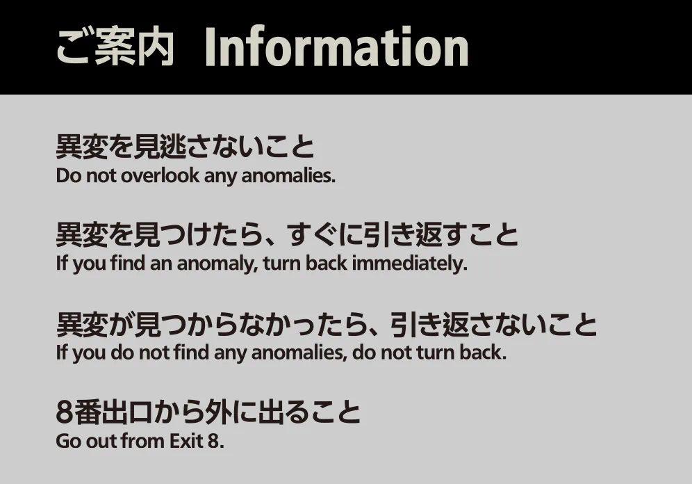 『8番出口』は主人公が突然迷い込んだ地下通路から脱出するお話なのですが、脱出するためのルールに【異変を見つけたら、すぐに引き返すこと】というのがあります。